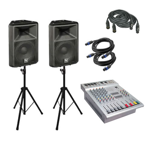 Equipo de sonido económico preparado para su uso con microfonía y fuentes varias, para charlas, reuniones, monólogos y escenografía así como pequeños directos y actuaciones.